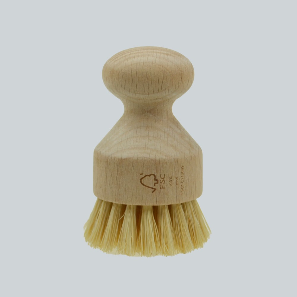 Grydebørsten er fremstillet af FSC certificeret bøgetræ og har børster lavet af 100 % naturlige fibre fra den mexicanske Raffia-palme.