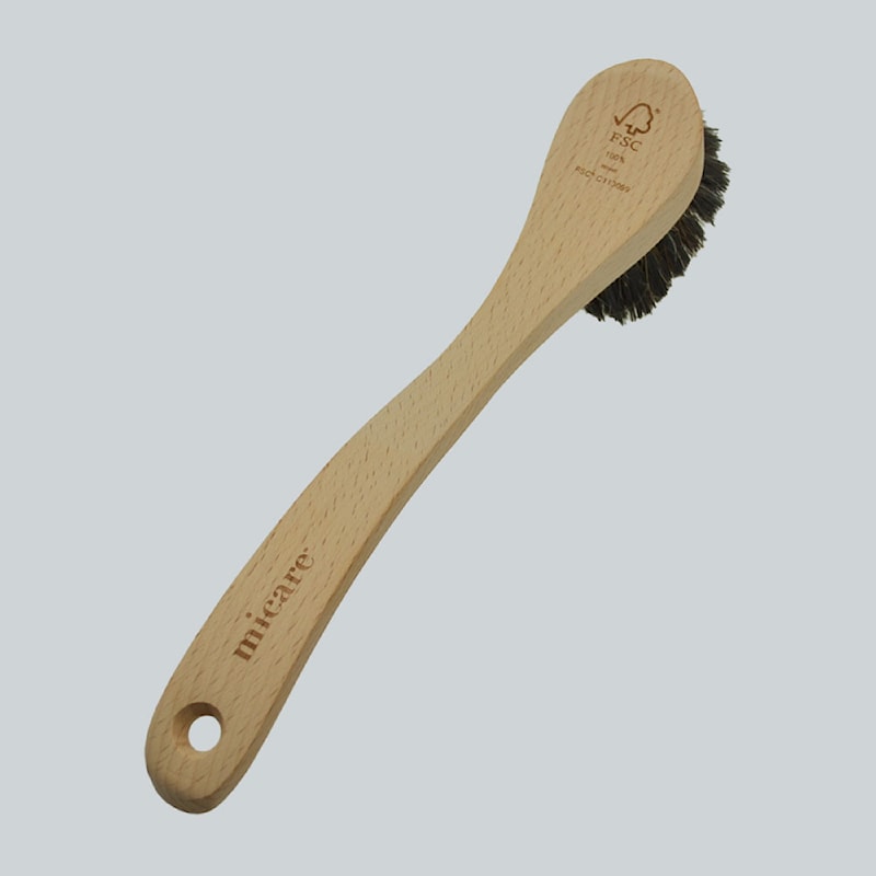 micare’s opvaskebørste er fremstillet af FSC-certificeret bøgetræ og hårene består af naturlige hestehår.