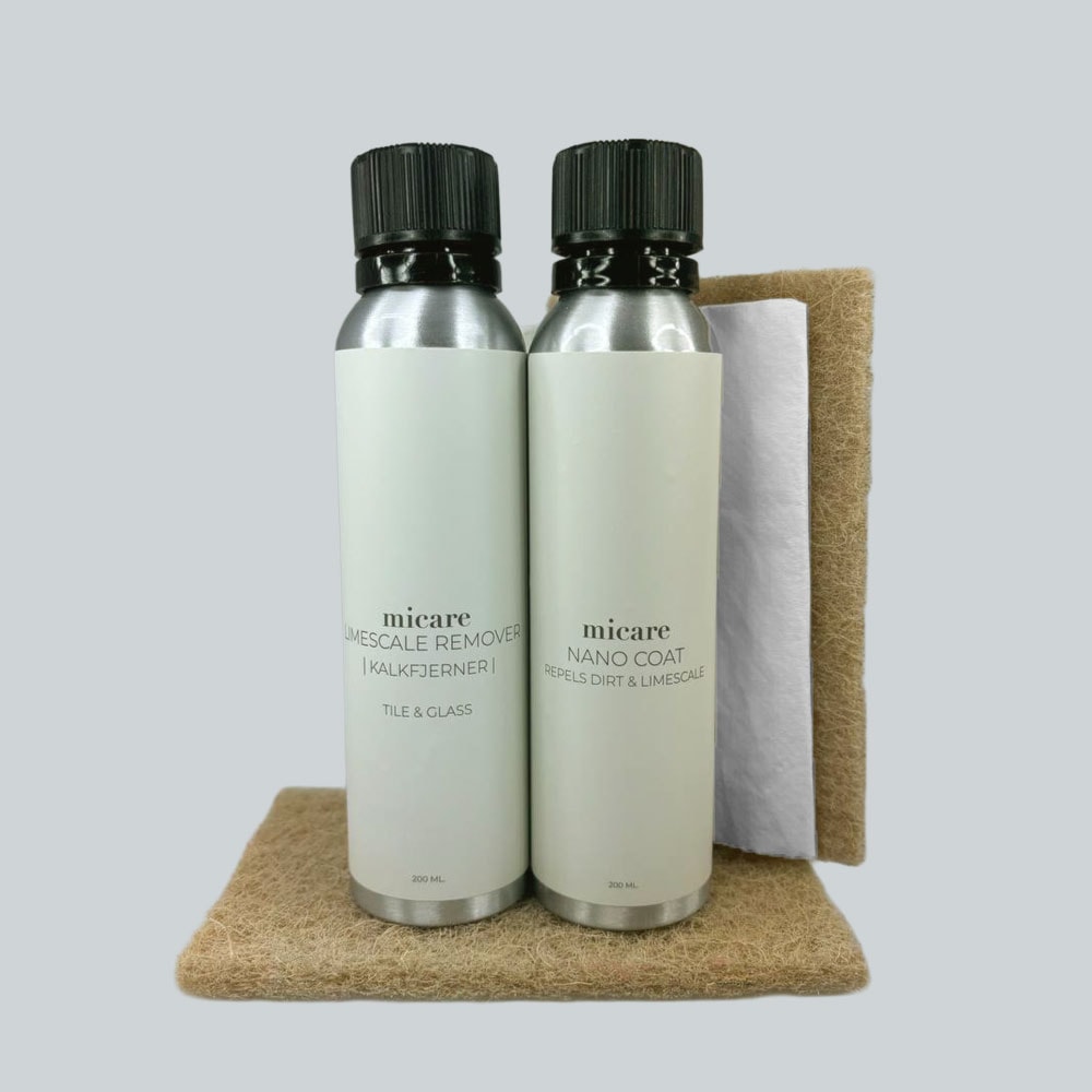 200 ml LIMESCALE REMOVER, 200 ml NANO COAT, 2 natural sisal scrubbing pads and 2 application cloths for NANO COAT.