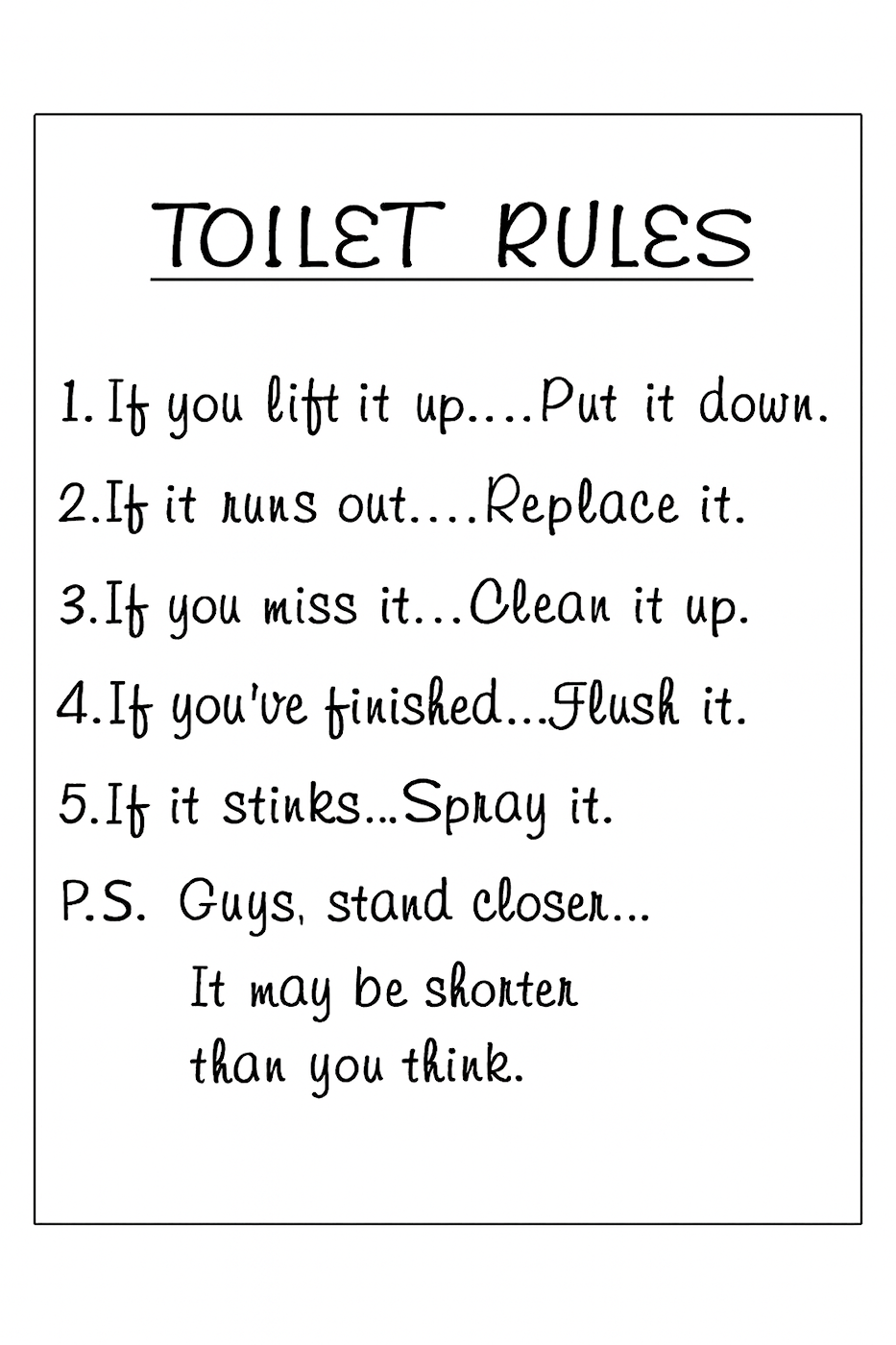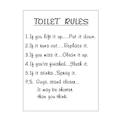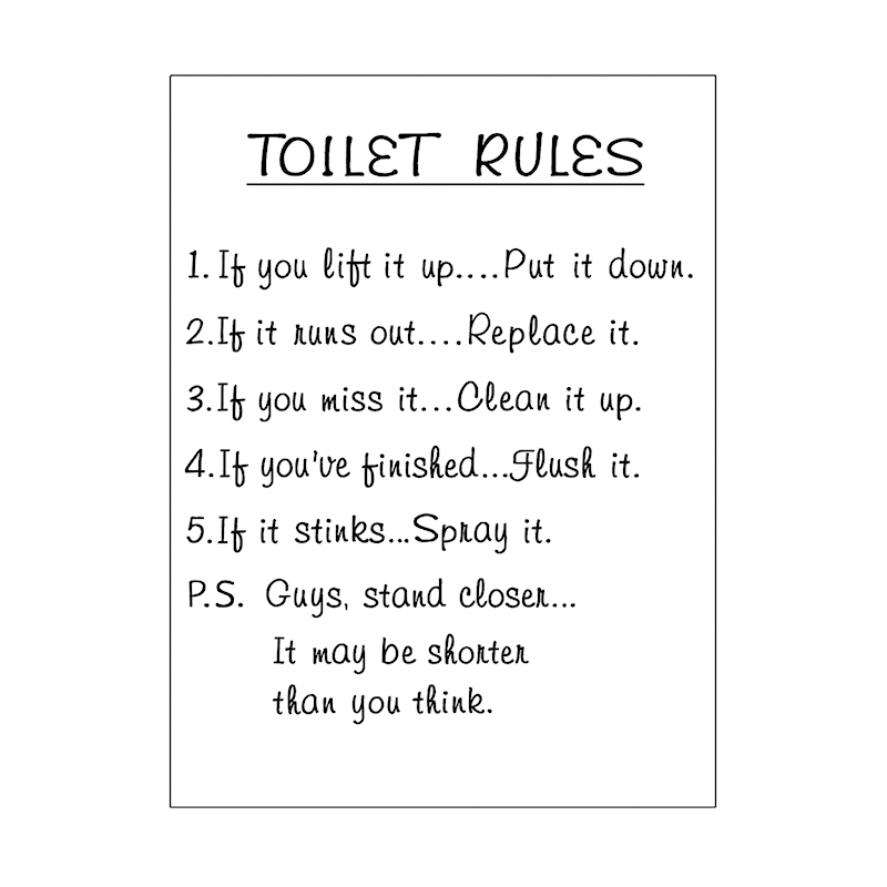 Featuring the text “Toilet Rules” and five simple bathroom guidelines, it combines humor and practicality – for a better experience and a cleaner toilet.
